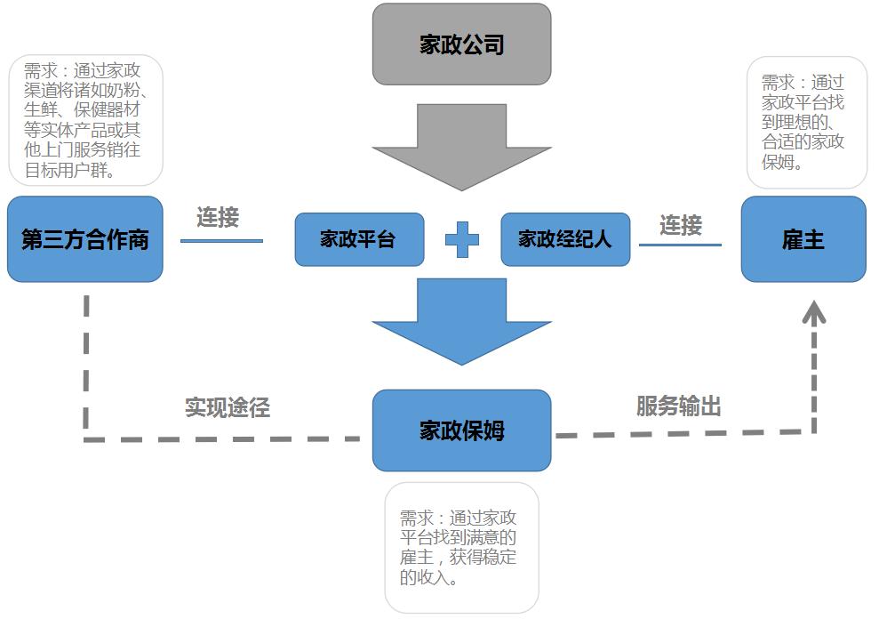 从上面的结构图中可以看到,在这个交易链条中有5个交易主体:第三方合作商、家政平台(背后是家政公司)、家政经纪人(可以是家政公司内部人员,也可以是与家政公司建立合作关系的合作伙伴)、家政保姆和雇主。其中最核心的主体是家政保姆,其他4个交易主体的需求均由家政保姆劳务输出的方式获得实现和满足。反过来,家政保姆的需求又依赖家政平台和家政经纪人的包装和对接。第三方合作商又可以实现家政平台服务内容的丰富及帮助雇主对满足需求的提升。由此,5个交易主体在需求上相互依存又交叉制约,从而构成一个稳固的交易结构。